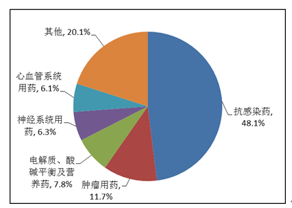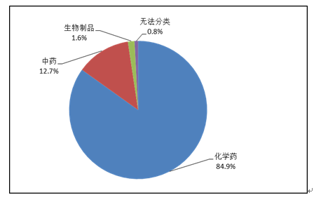 按照藥品類(lèi)別統(tǒng)計(jì),化學(xué)藥品占86.6%,中藥占12.6%,生物制品占0.8%?;瘜W(xué)藥品排名居前的藥品類(lèi)別是抗感染藥、心血管系統(tǒng)用藥、腫瘤用藥、神經(jīng)系統(tǒng)用藥、電解質(zhì)、酸堿平衡及營(yíng)養(yǎng)藥;中藥排名居前的藥品類(lèi)別是理血?jiǎng)?、補(bǔ)益劑、祛濕劑、開(kāi)竅劑、清熱劑。